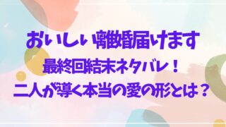 ドラマ おいしい離婚届けます最終回結末ネタバレ!二人が導く本当の愛の形とは? ドラマ「おいしい離婚届けます」は、2025年10月から深夜枠で放送が開始された、リーガル×ヒューマンストーリーです。 主演は、前田公輝(敏腕弁護士)と水沢林太郎(探偵)のW主演。 配偶者の裏切りや愛のトラブルで苦しむ人々から離婚案件を請け負... 2025.10.16 ドラマ